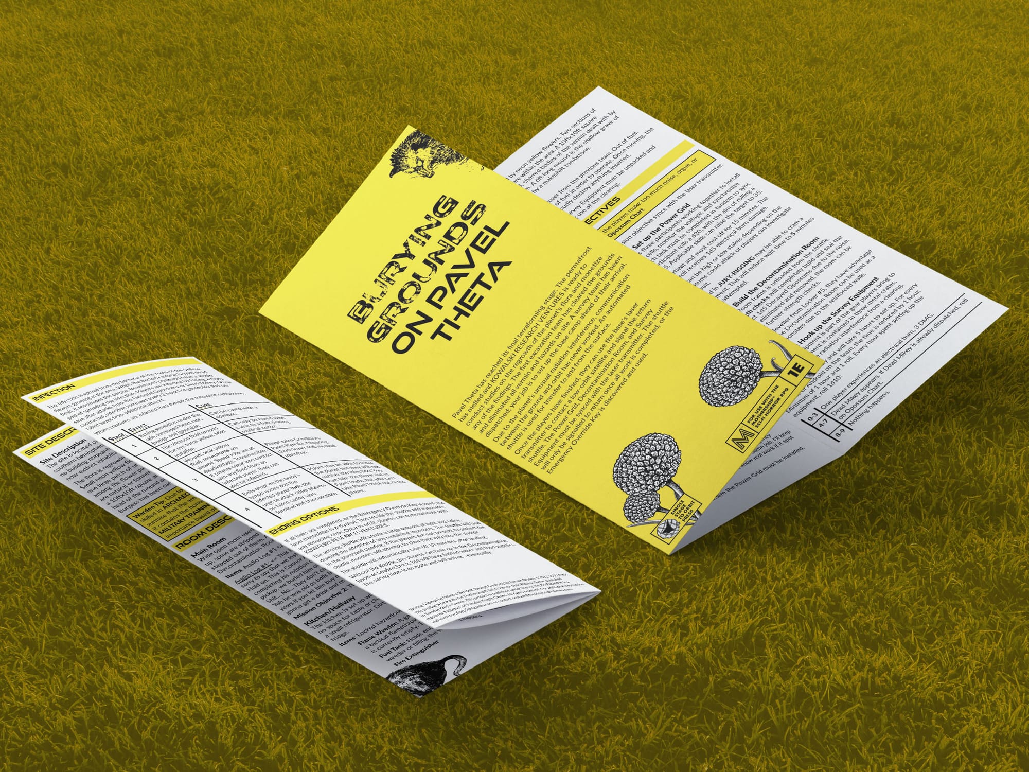 PamphletSet up the base camp on Pavel Theta, a planet scheduled for survey and archaeology research. The first excavation team has cleared the grounds and eliminated all vermin and hazards at the site. The mounds of earth covered in neon yellow flowers tell a different story.