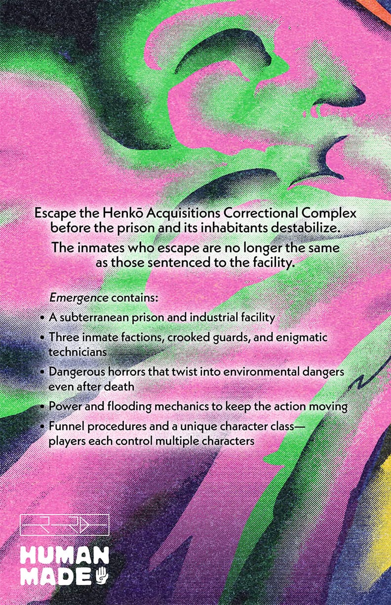 Emergence is a 32-page module compatible with the Mothership sci-fi horror RPG. Each player controls four inmates, twisting the classic Mothership experience into a funnel adventure. Player characters that escape to the surface have an origin story told right at the table. A class-less character type includes random tables to generate what sent the inmate to the prison, starting gear, and skill. To keep the action moving, each character has a new attribute, Cohesion, with plenty of opportunities to see what happens when it reaches zero.
