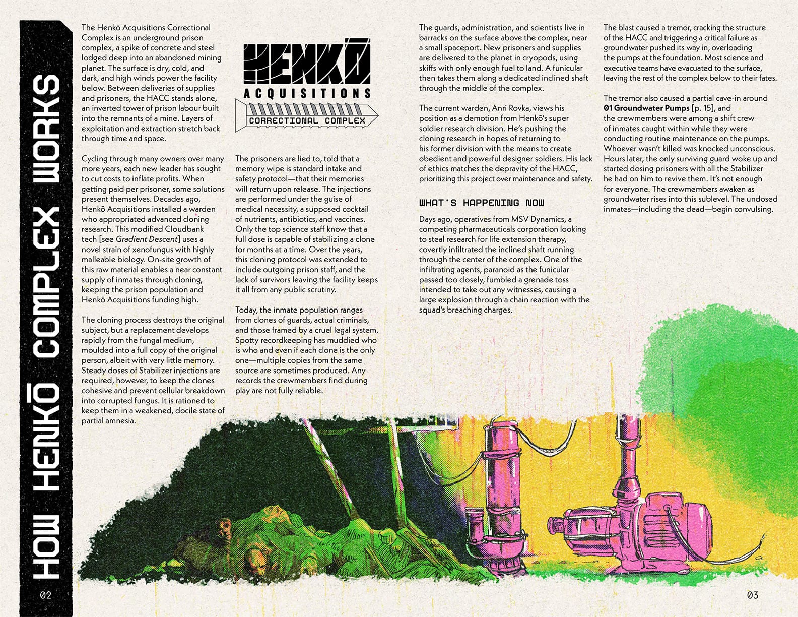 The Henkō Acquisitions Correctional Complex is an underground prison, a spike of concrete and steel lodged deep into an abandoned mining planet. The surface is dry, cold, and dark, and high winds power the facility below. Between deliveries of supplies and prisoners, the HACC stands alone, an inverted tower of prison labour built into the remnants of a mine. Layers of exploitation and extraction stretch back through time and space.