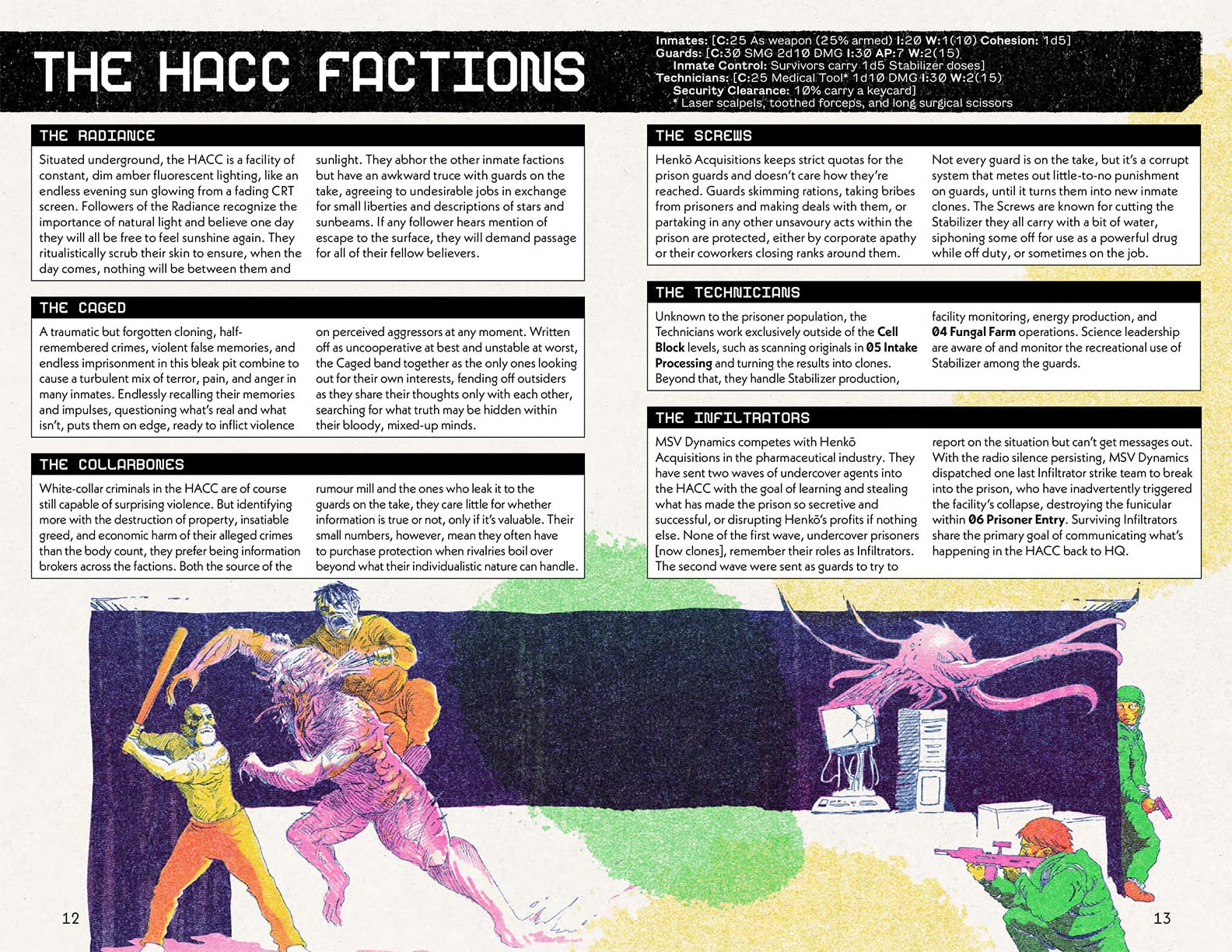 ZineA tremor has cracked the structure of the subterranean prison, and the player characters awaken at the bottom level. These weak inmates regained consciousness after doses of a pink fluid—Stabilizer—by the single surviving guard on their detail. The inmates under a heap of nearby rubble weren’t so lucky, and it looks like the corpses are starting to convulse…
