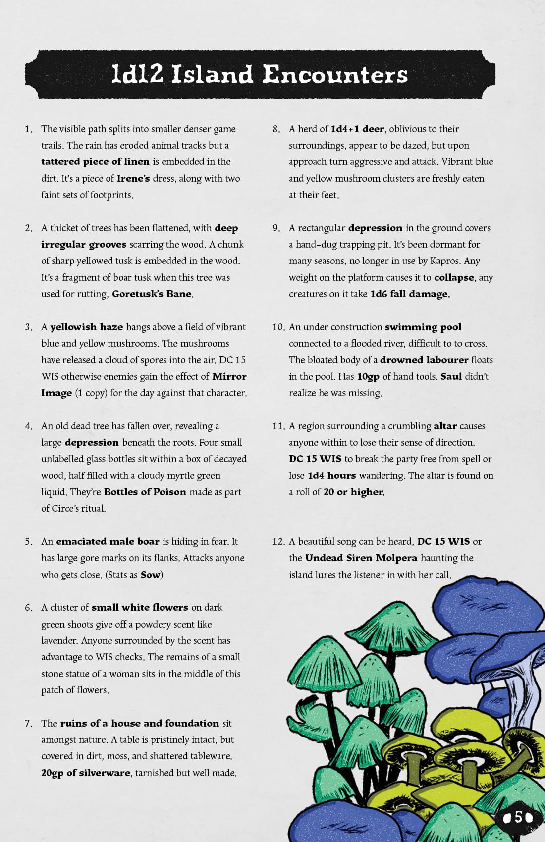 ZineA young couple have gone missing on a rich noble's private island. You’ve been hired to investigate the disappearance, and explore the rest of the island's wilderness to find them. A collaboration with Chris Saunders for the Weird Tales Shadowdark Game Jam.