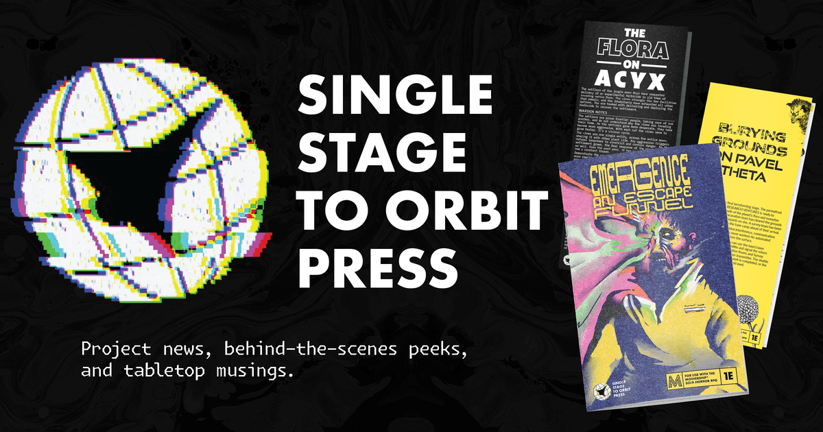 First, if you or a friend is looking to pick up Emergence, this special is the first time it’s been marked on sale, down to the backer price during the crowdfunding campaign. You can pick it up for US$8, and it’ll come with my two pamphlet adventures, The Flora on Acyx and Burying Grounds on Pavel Theta.
